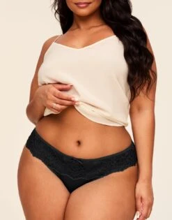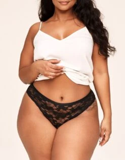 This sultry little number is perfect for those who want to show some skin without revealing too much. The Alana Bikini in Dark Red features a lace front with a mesh back and ribbon side ties. (Available in plus-sizes 0X-4X.)