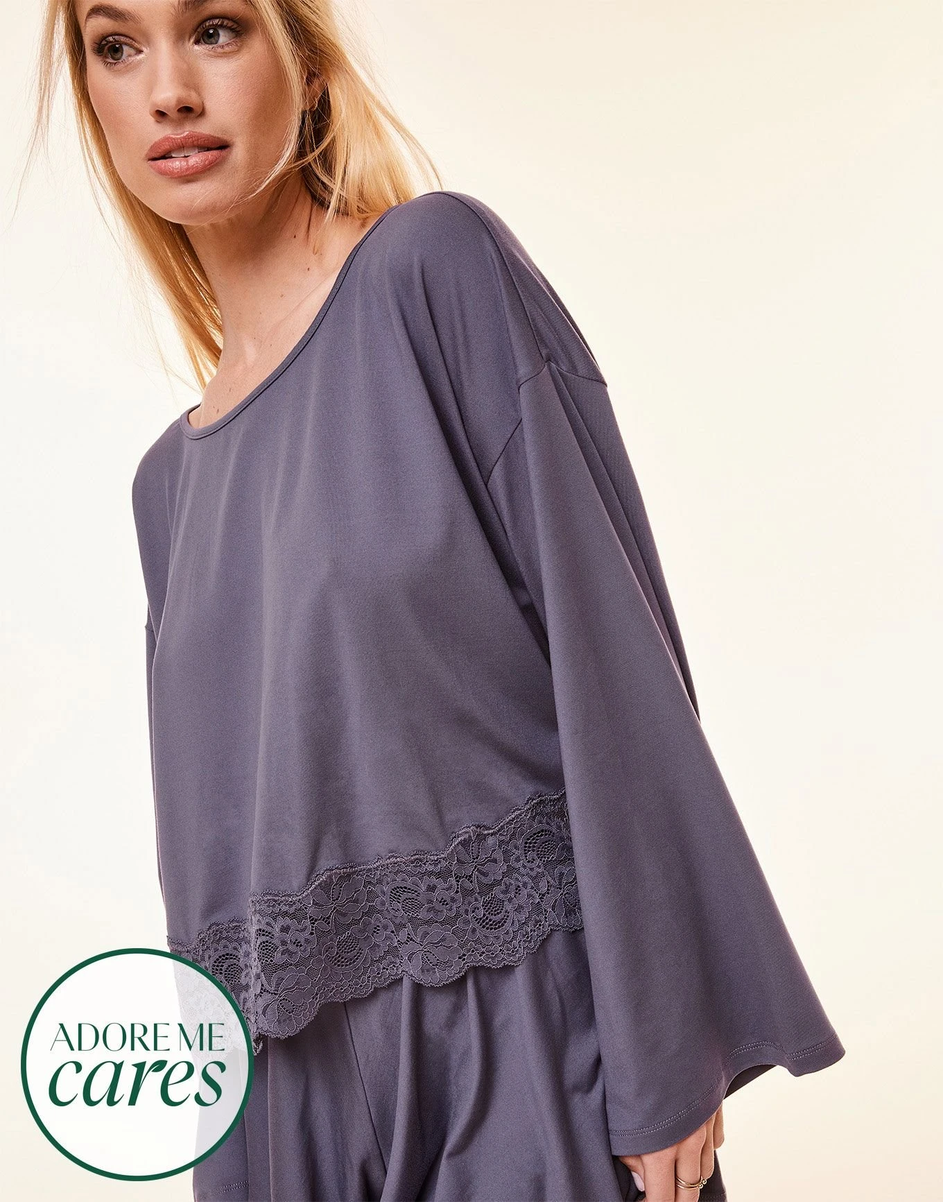 The Ande PJ set is a stylish and comfortable way to lounge around the house. The long bell sleeves and cropped hem with lace trim make this PJ set perfect for lounging and sleeping. The set is made with recycled polyester for a sustainable, comfy product. (Available in XS-XL).