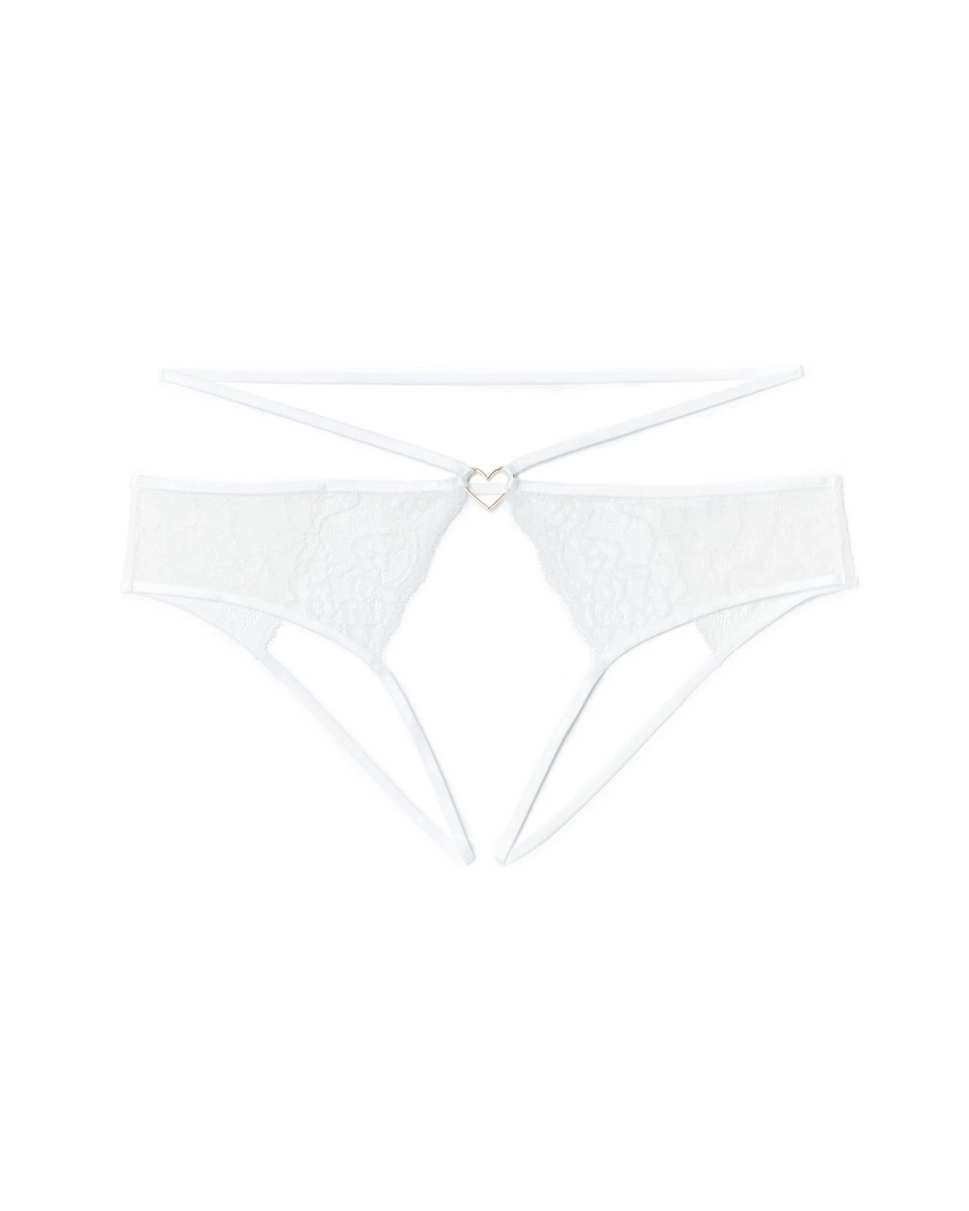 Live out your boldest fantasies in the bedroom with this super sexy crotchless bikini. The Danielle Bikini in white features a revealing open front and back, with lace side panels and heart-shaped hardware for an added touch of fun. (Available in sizes XS-XL.)