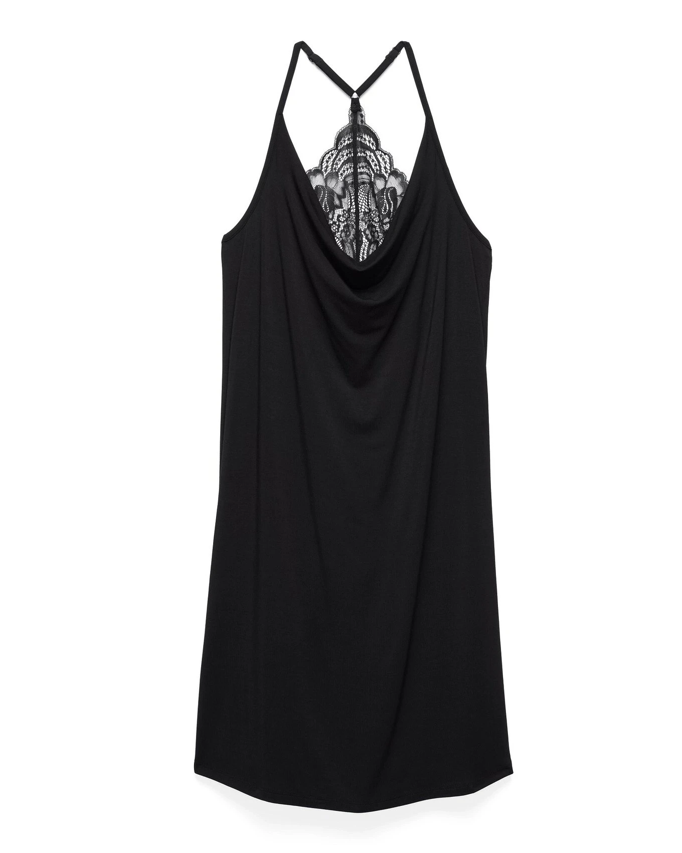 Business in the front, party in the back! Slip into something more comfortable yet classy with our cowl-neck knit slip featuring a lace racerback design from behind. (Available in sizes up to 4X!)