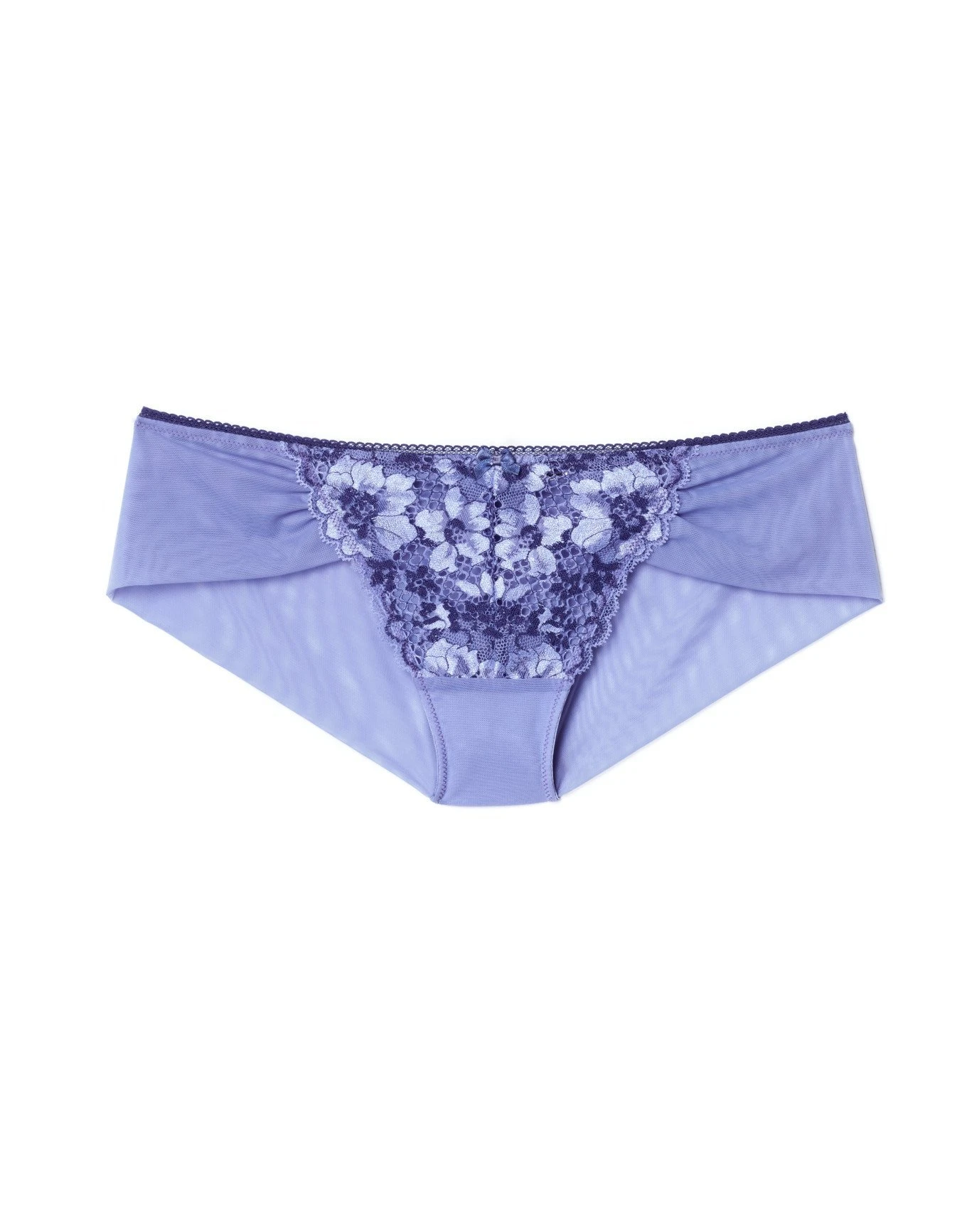 This romantic hipster is made with cross-dyed lace, a lace-front panel, and mesh back. With a contrast trim and satin bows, this hipster is the perfect addition to your lingerie collection. (Available in sizes XS-XL.)
