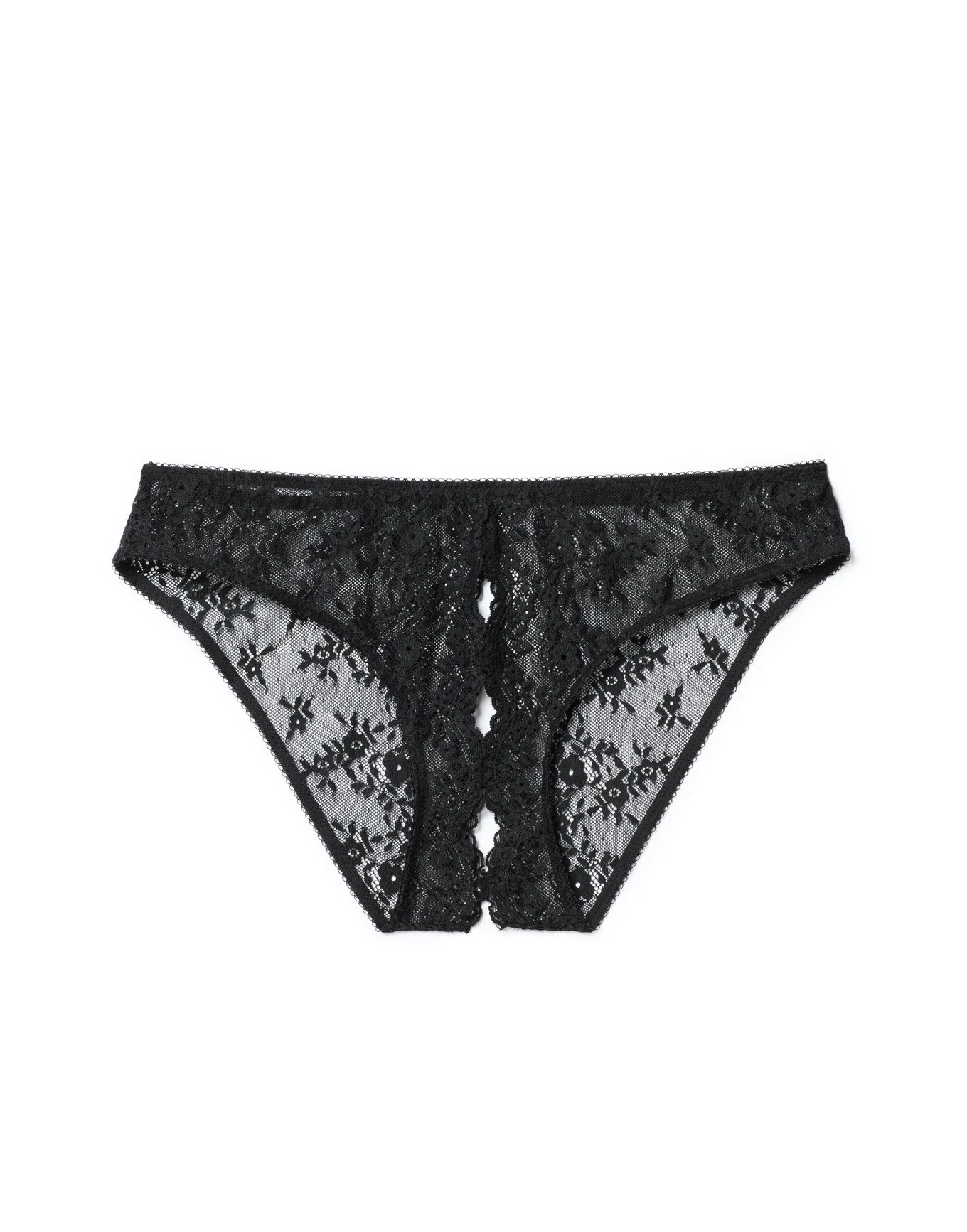 The Rosia crotchless bikini is a unique and daring black lace panty that features a scalloped lace edge and a see-through opening at the crotch. This bold style is perfect for a special night in (available in XS-XL).
