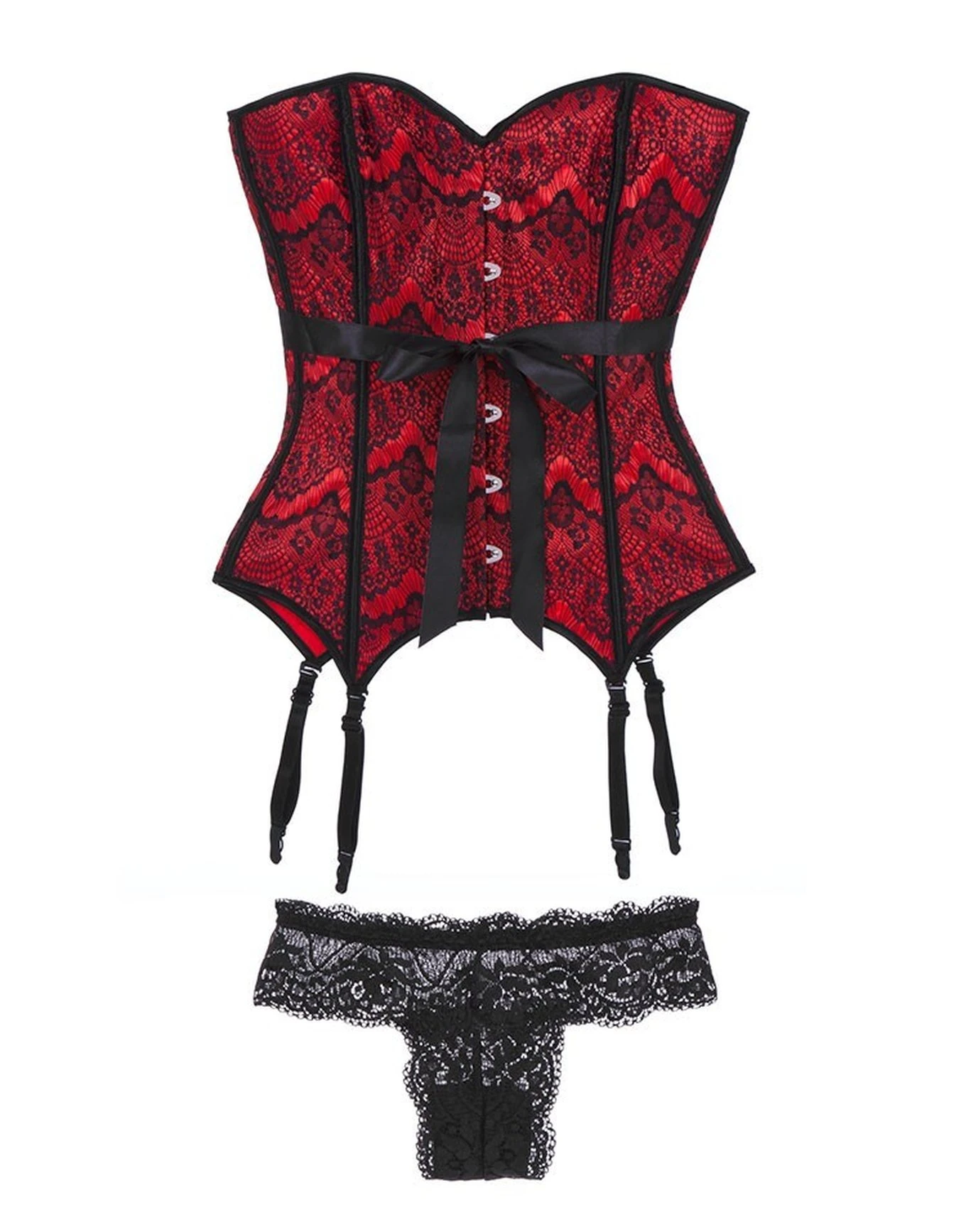 Hold nothing back with our red hot Scarlett corset! With supportive yet soft boning and a lace-up back, the entire design is designed to enhance your silhouette. For more bust support, pair it with a strapless bra. A matching lacy black thong completes the look.