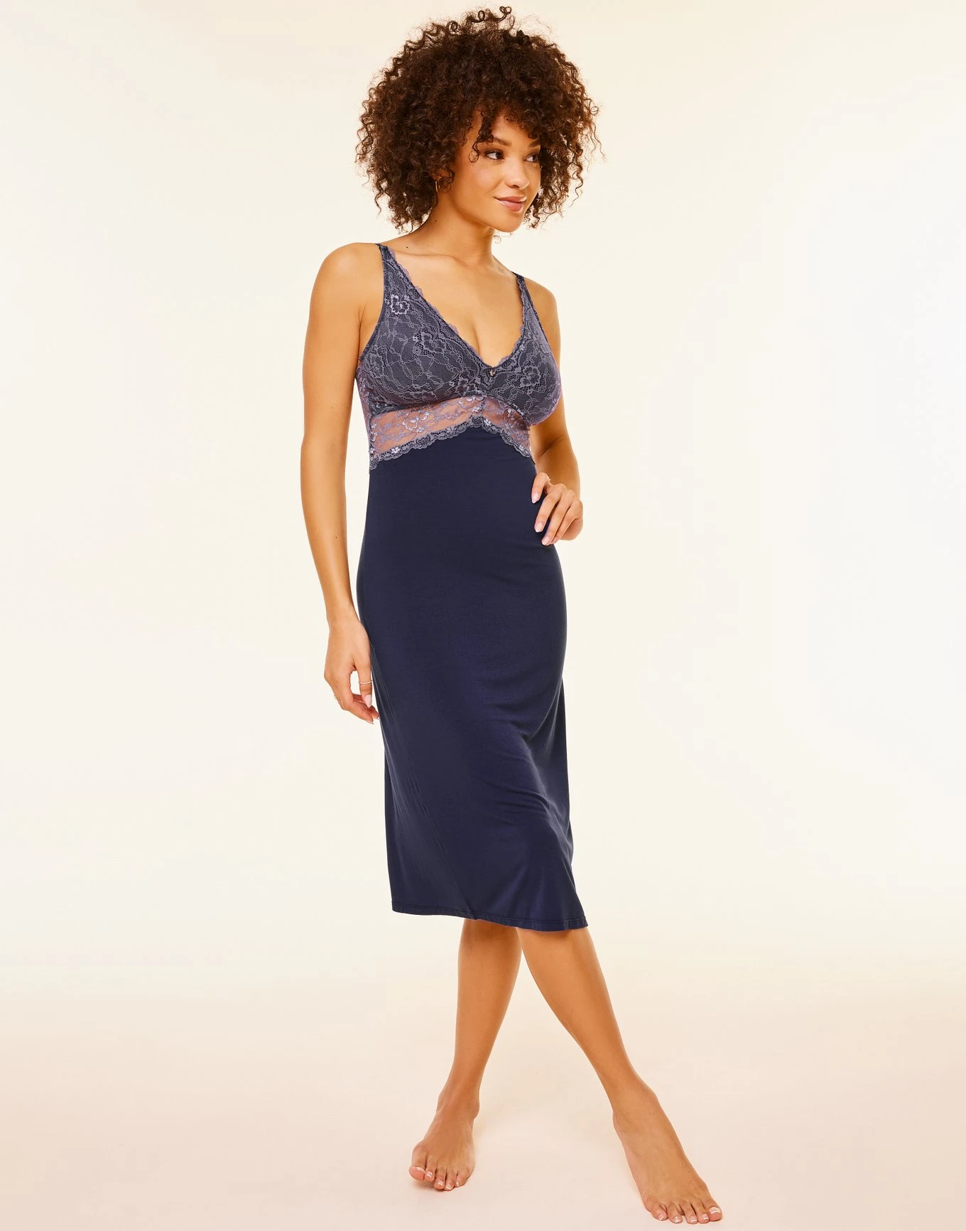 Feel flirty and frilly in this blue midi slip dress that features spaghetti strap lace details, lace triangle cups, and lace cutouts at the underbust. The fitted silhouette with adjustable back straps makes this slip dress super flattering and comfortable. (Available in XS-XL).
